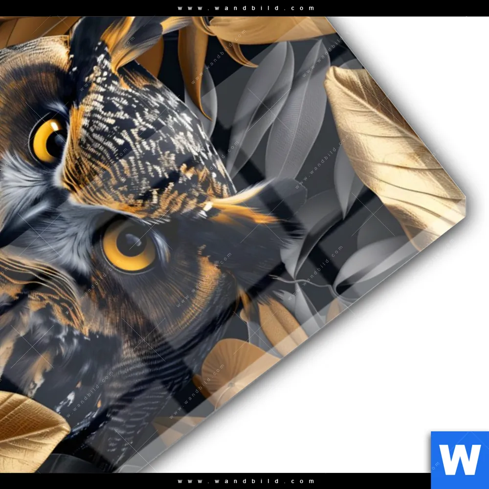 Acrylglasbild | Eule und goldene Blätter | Hochformat