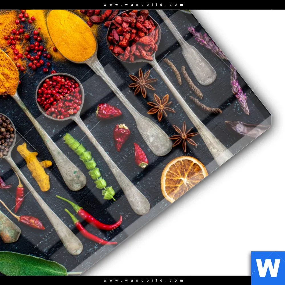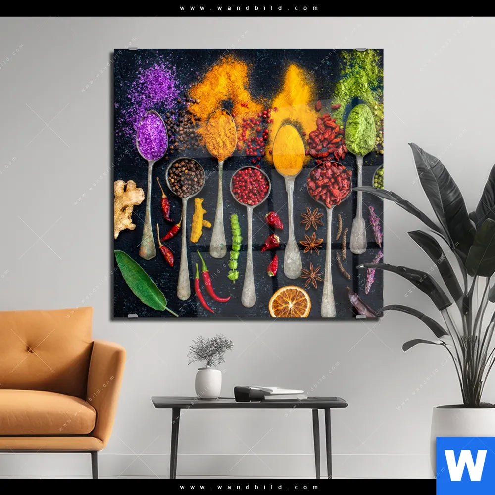 Acrylglasbild | Exotische Gewürze auf Löffeln | Quadrat