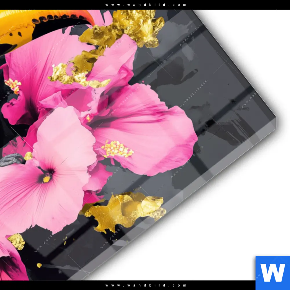 Acrylglasbild | Exotischer Tukan mit Blüten | Querformat