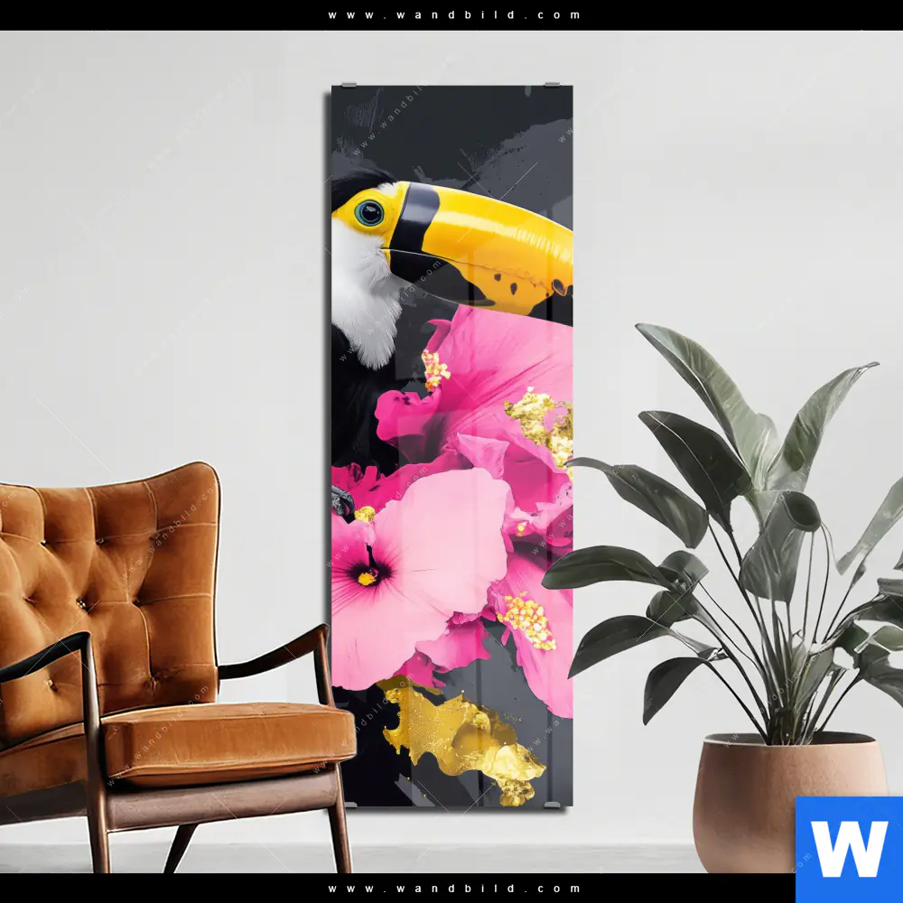 Acrylglasbild | Exotischer Tukan mit Blüten | Schmal