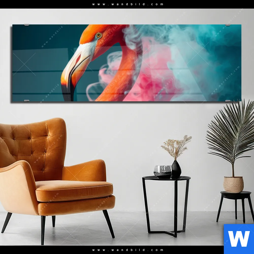 Acrylglasbild | Flamingo in bunter Rauchwolke | Panorama