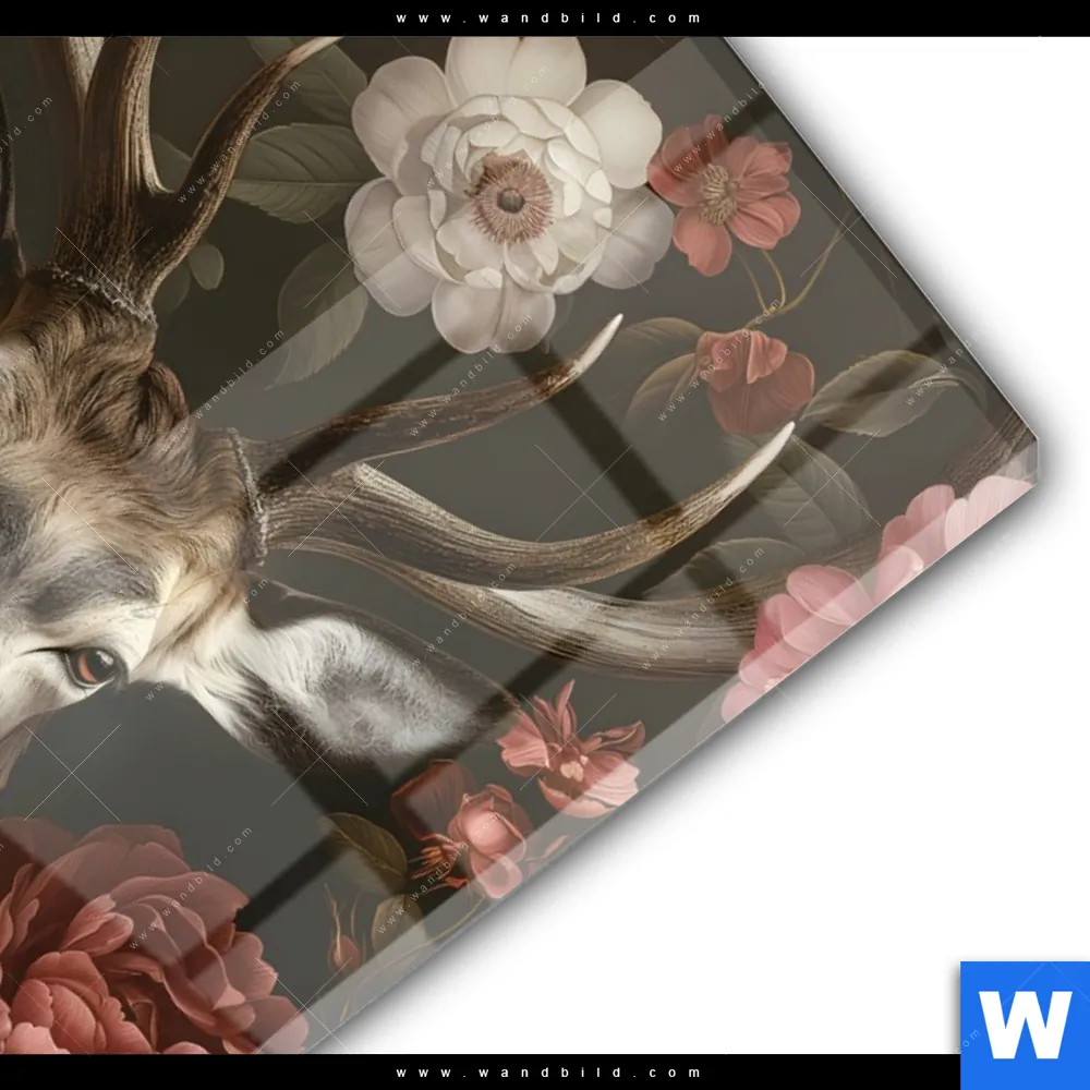 Acrylglasbild | Friedlicher Hirsch und Blüten | Hochformat