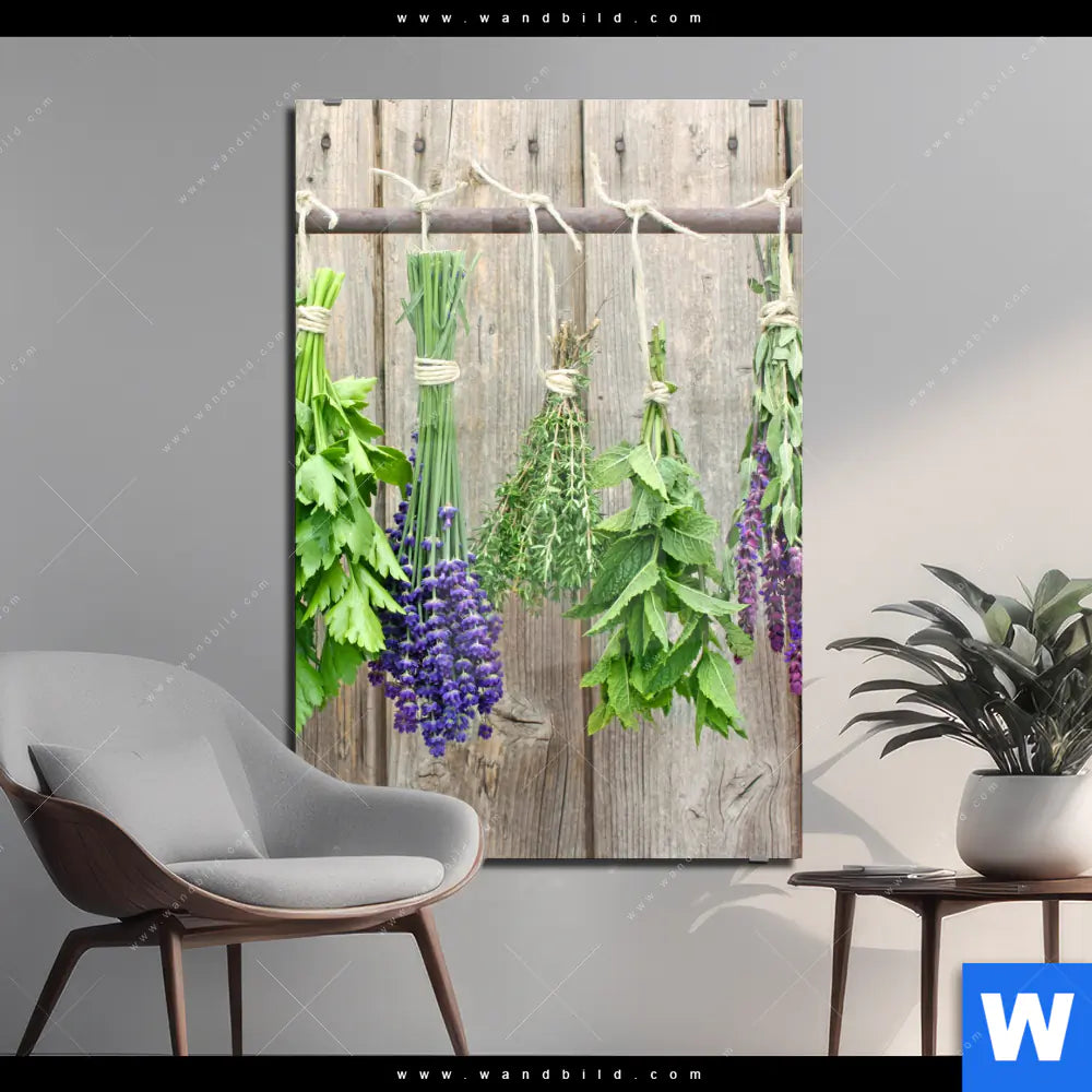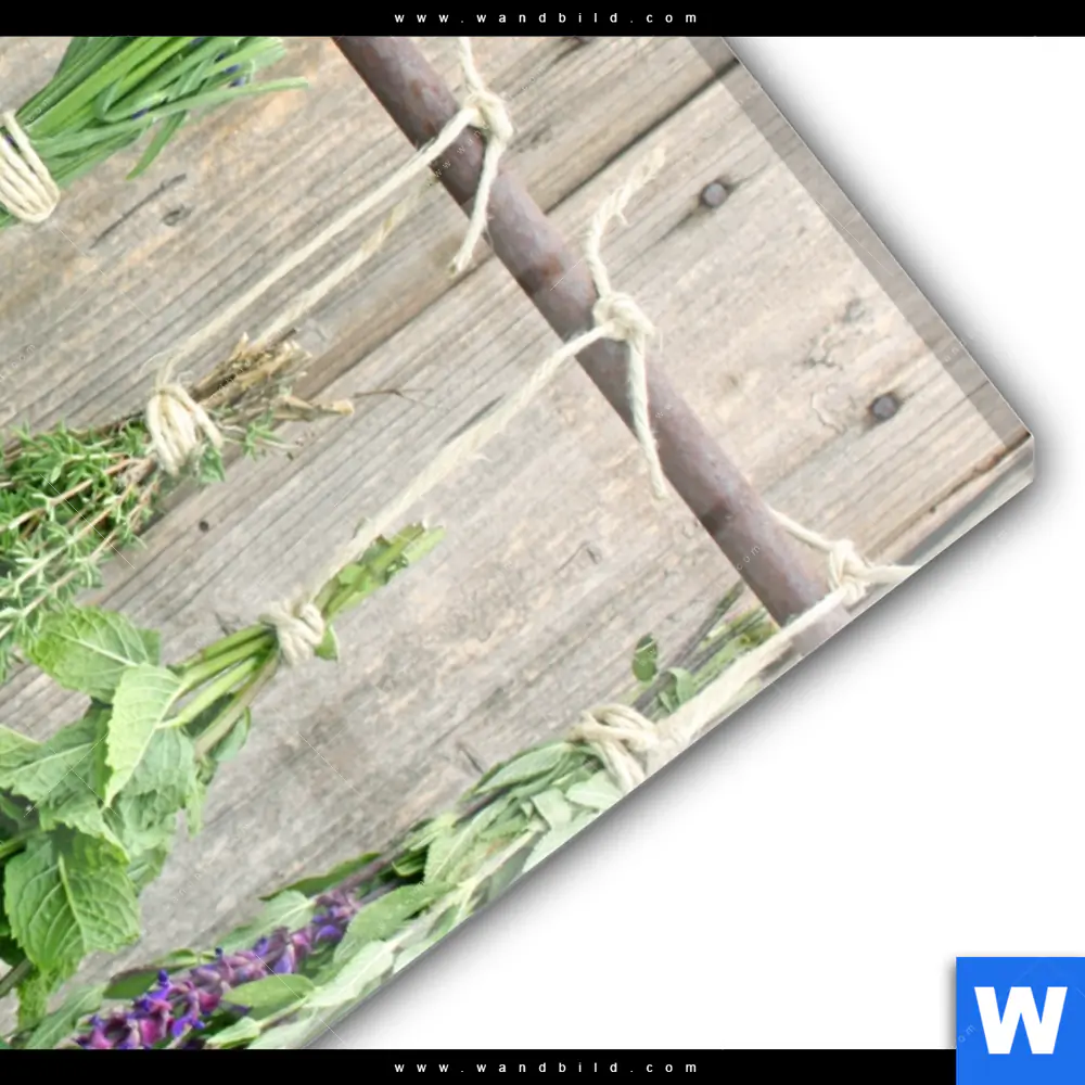 Acrylglasbild | Frische Kräuter an Holzstange | Hochformat