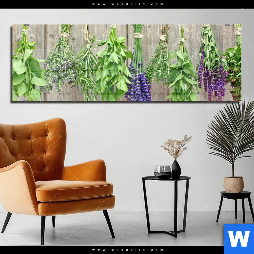 Acrylglasbild | Frische Kräuter an Holzstange | Panorama