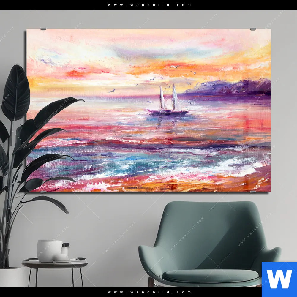 Acrylglasbild | Gemälde mit Boot im Sonnenuntergang | Querformat
