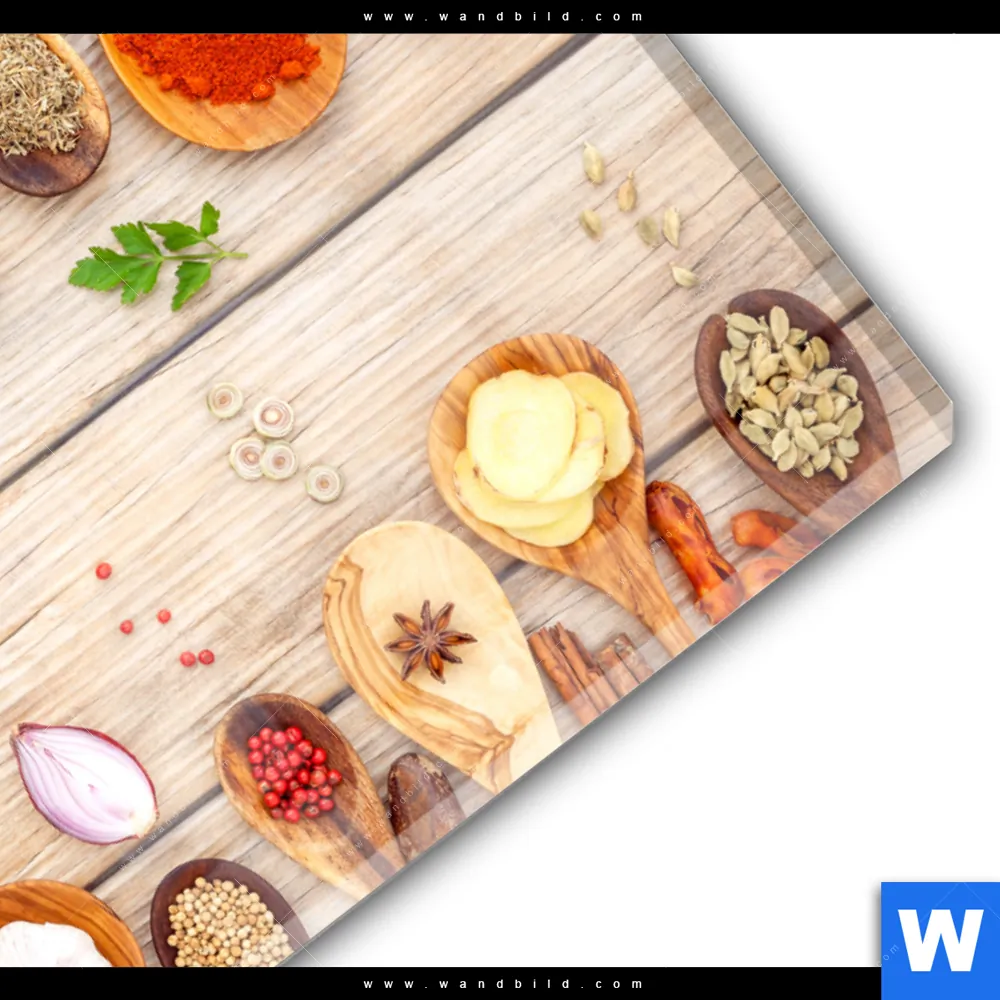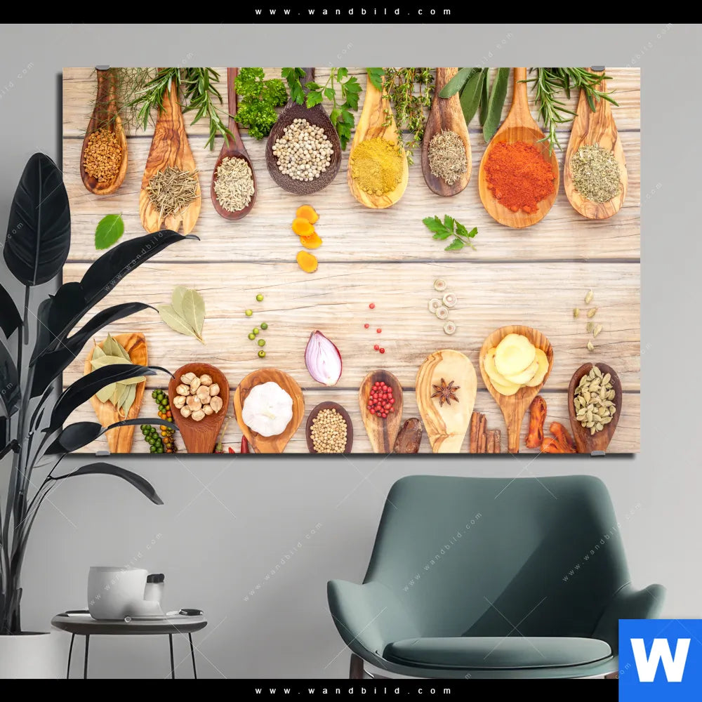 Acrylglasbild | Gewürze auf hölzernen Löffeln | Querformat