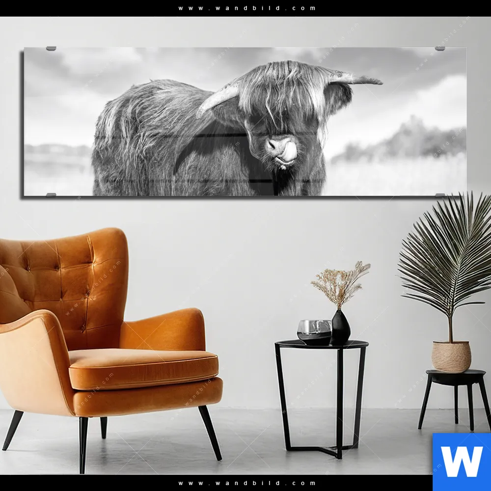 Acrylglasbild | Hochlandkuh auf einer Wiese | Panorama