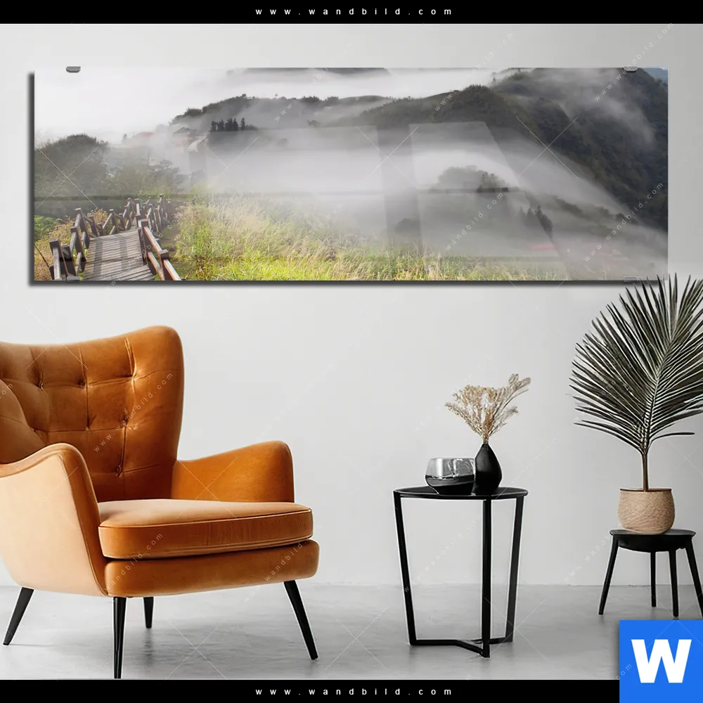 Acrylglasbild | Holztreppe auf Berg mit Wolken | Panorama