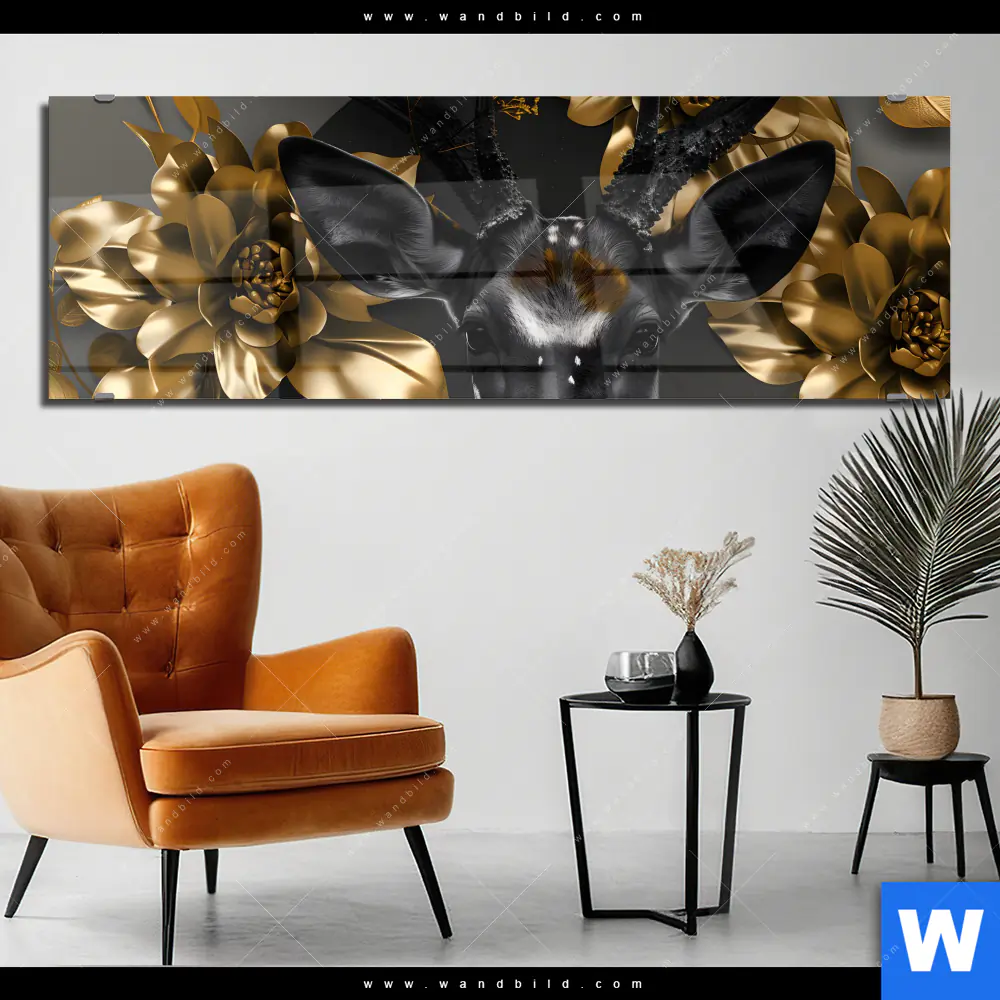 Acrylglasbild | Junger Hirsch und Goldblumen | Panorama