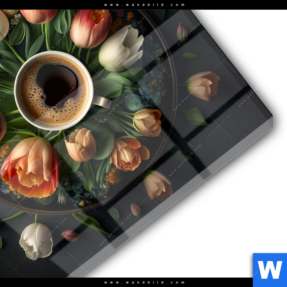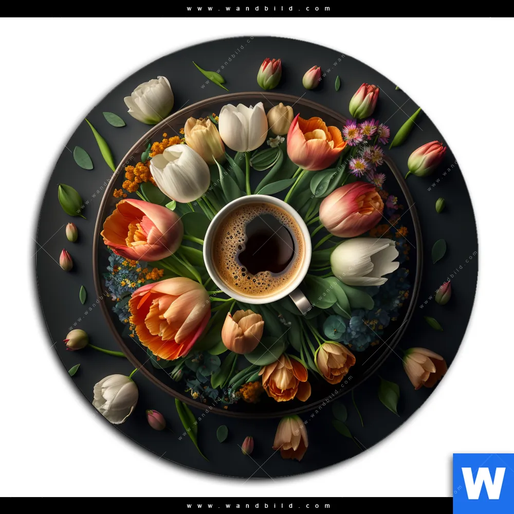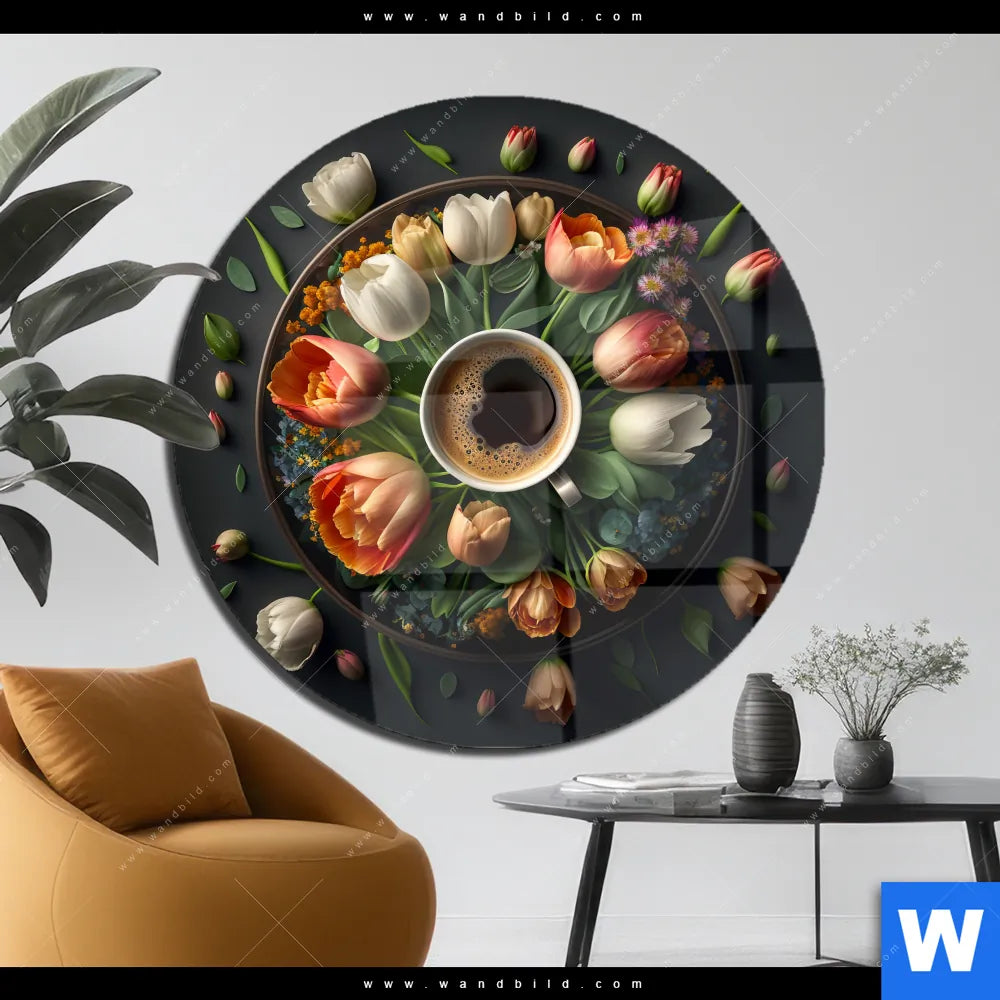 Acrylglasbild | Kaffee inmitten wunderschöner Blumen | Rund