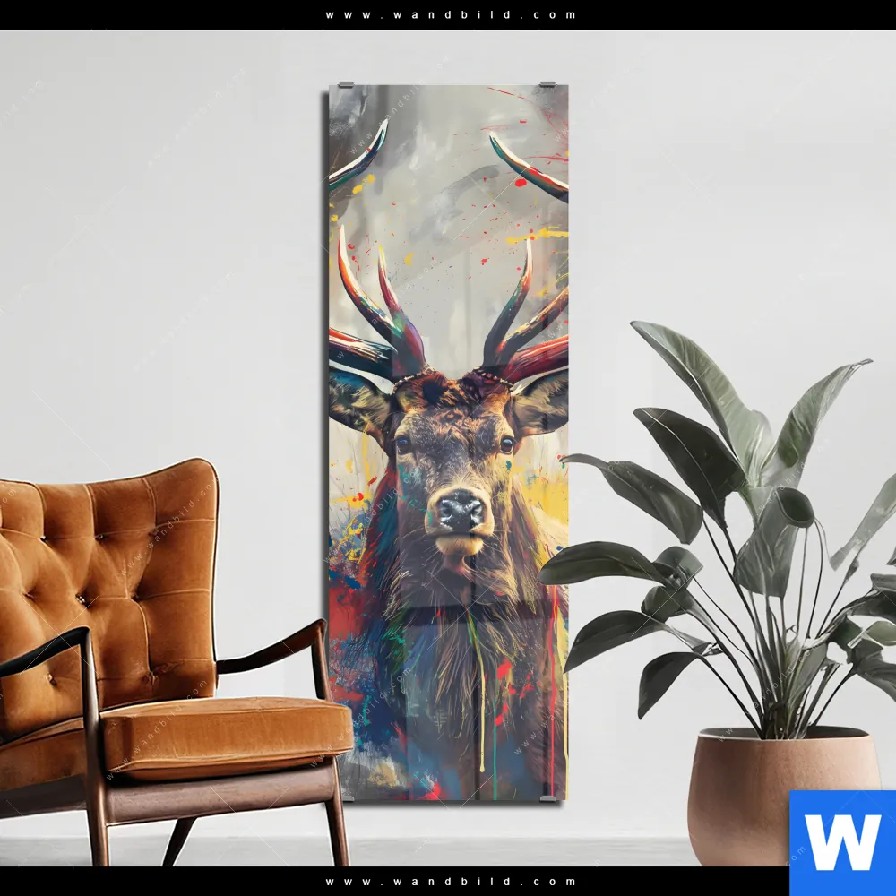 Acrylglasbild | Kreativer Hirsch mit Farbspritzern | Schmal