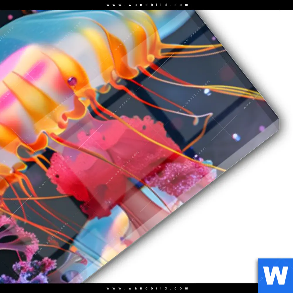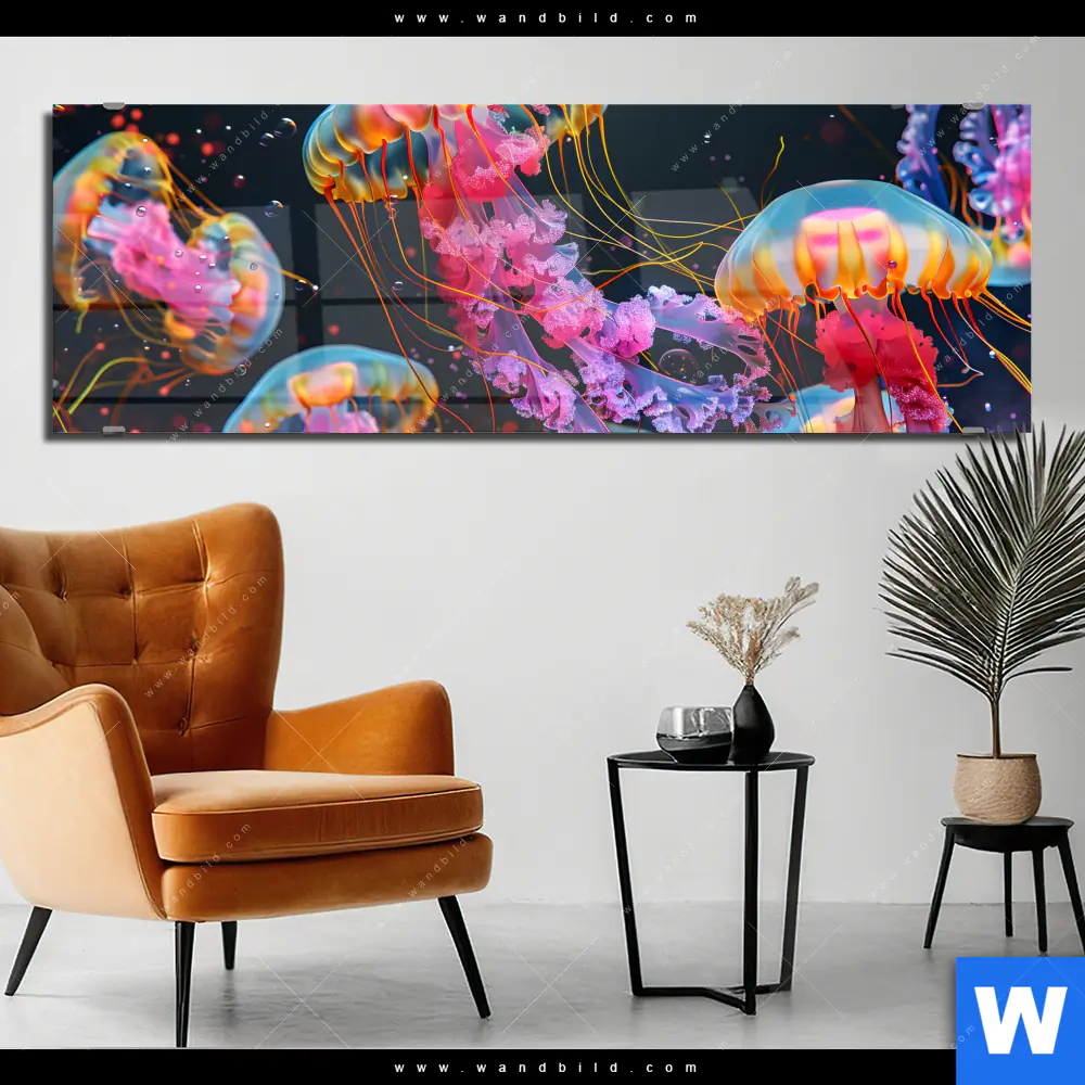 Acrylglasbild | Leuchtende Quallen unter Wasser | Panorama