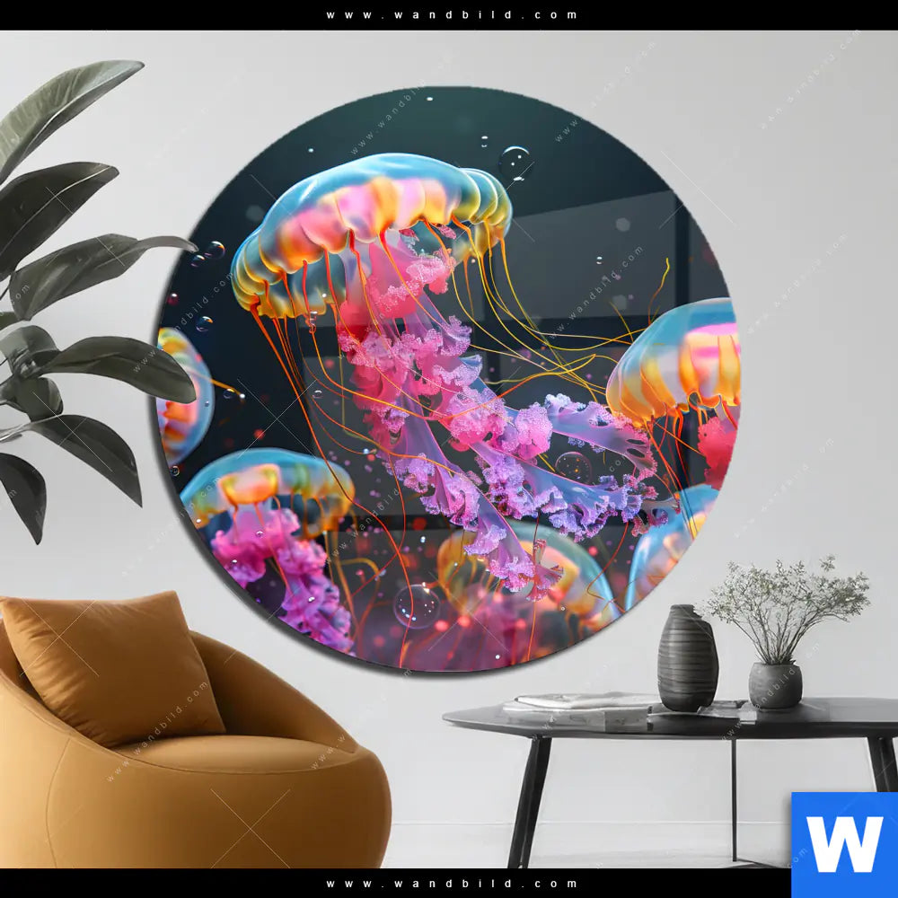 Acrylglasbild | Leuchtende Quallen unter Wasser | Rund