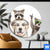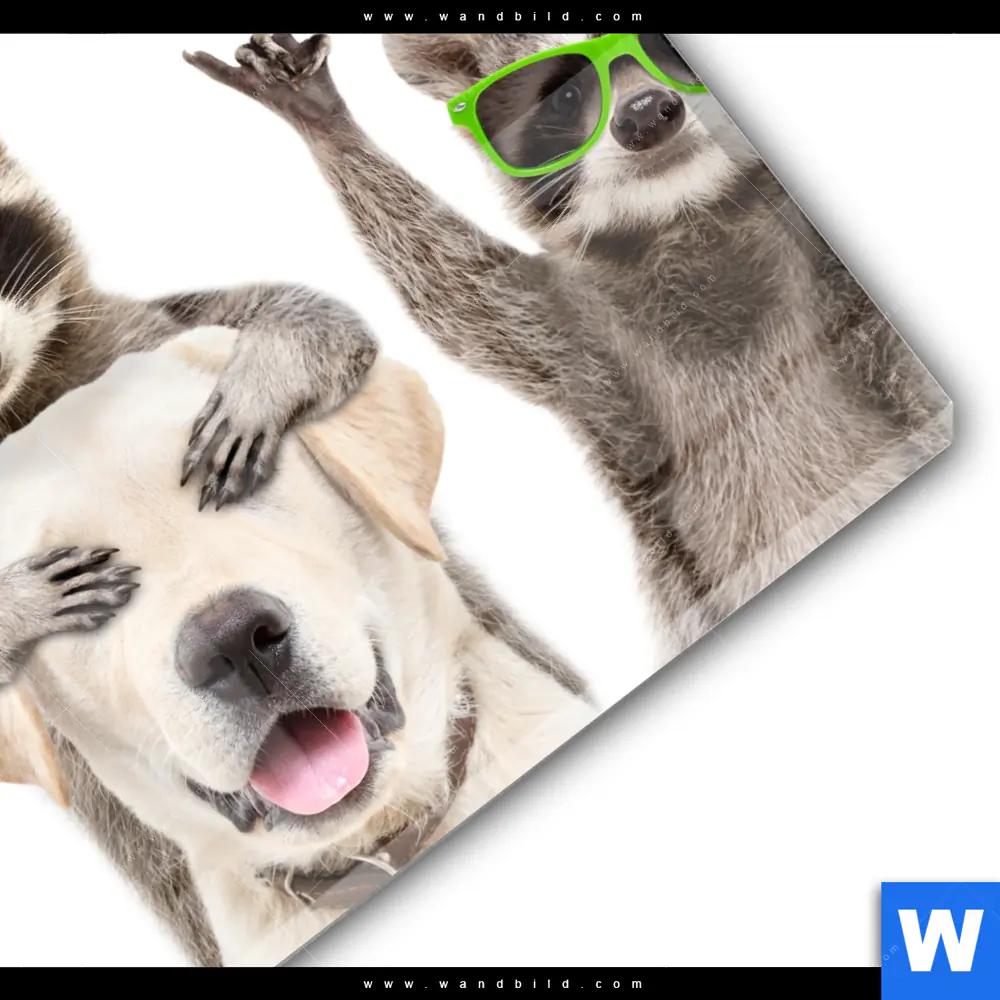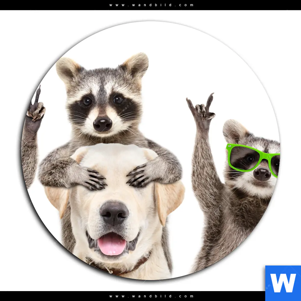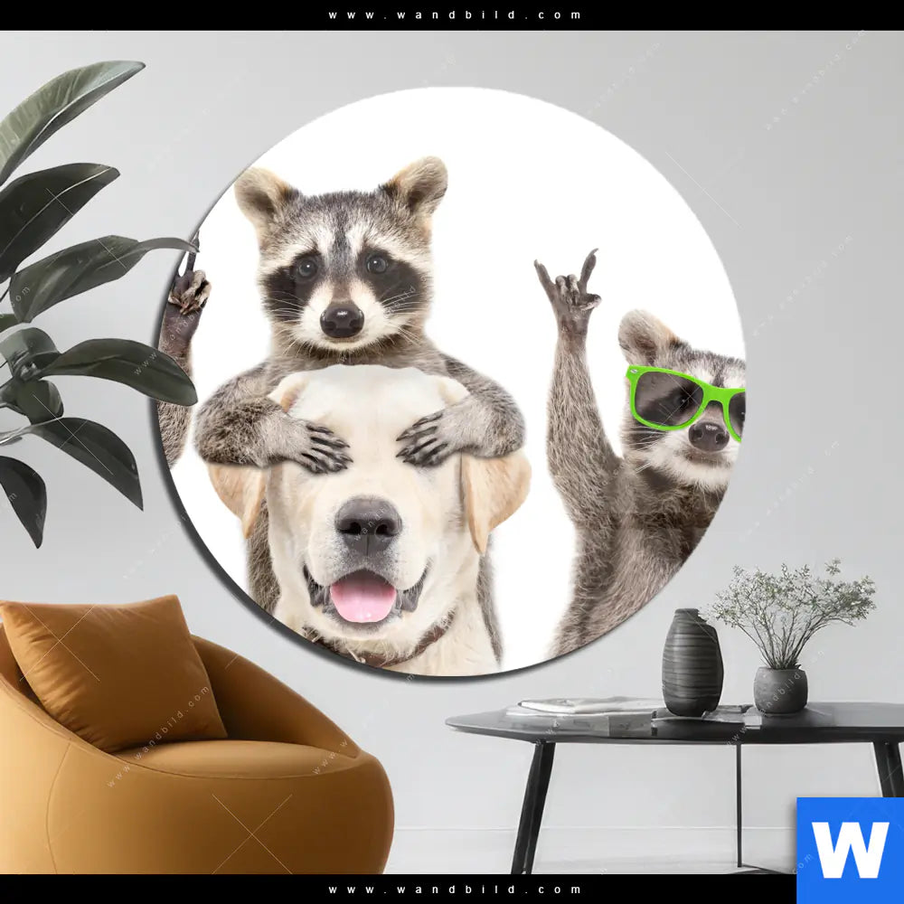 Acrylglasbild | Lustige Waschbären mit Hund | Rund