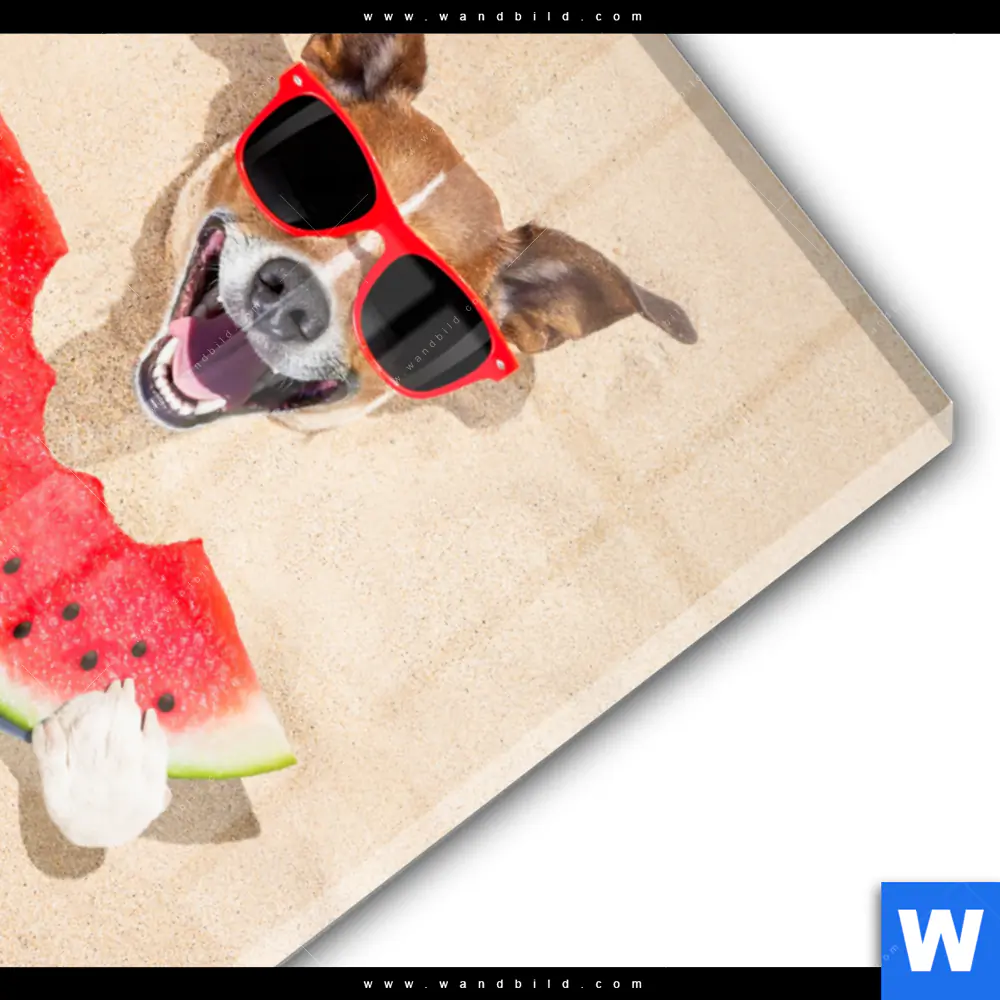Acrylglasbild | Lustiger Hund am Strand | Hochformat