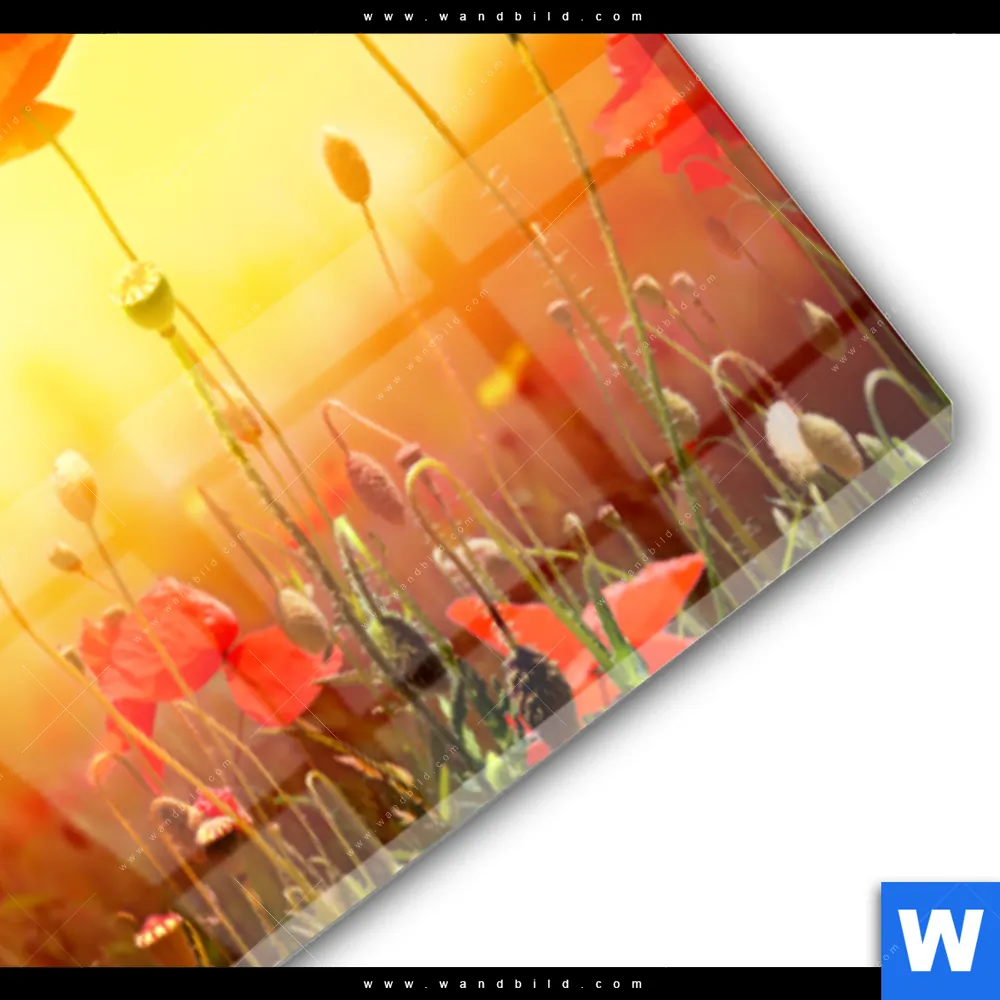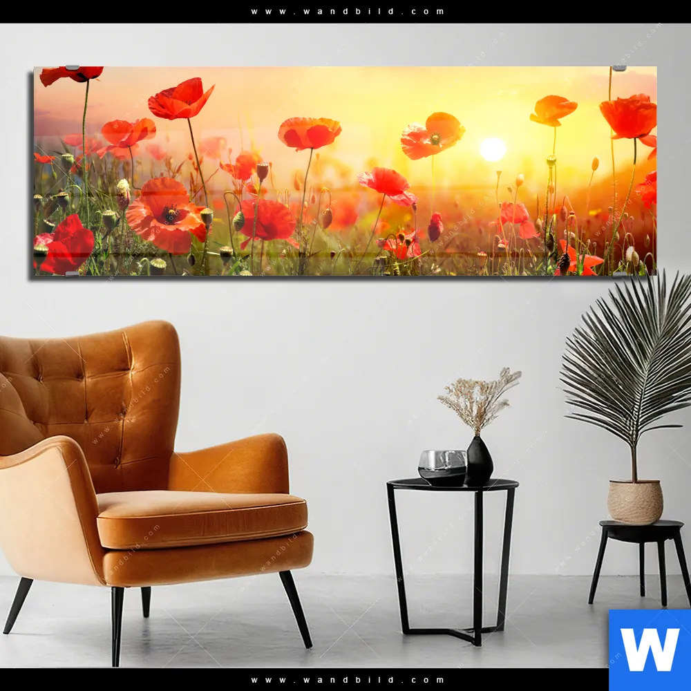 Acrylglasbild | Mohnblumenfeld bei Sonnenuntergang | Panorama