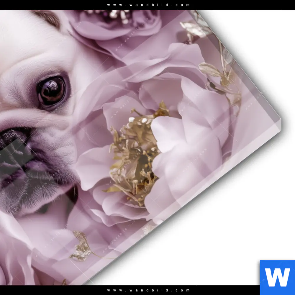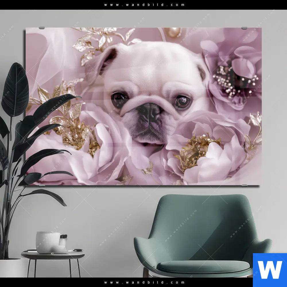 Acrylglasbild | Mops im Blütenmeer | Querformat