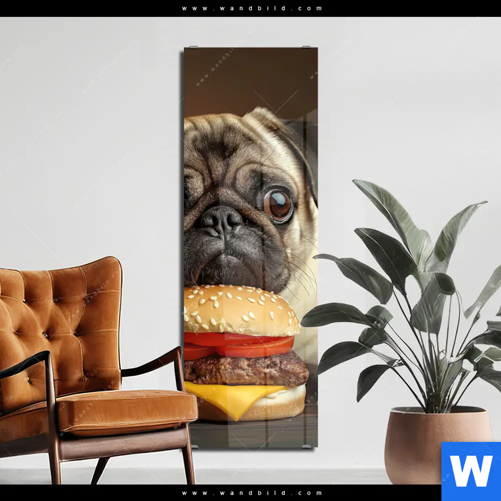 Acrylglasbild | Mops mit Cheeseburger | Schmal