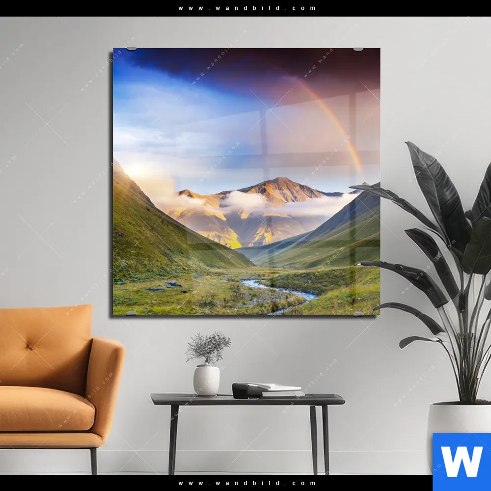 Acrylglasbild | Nebel und Regenbogen zwischen den Bergen | Quadrat