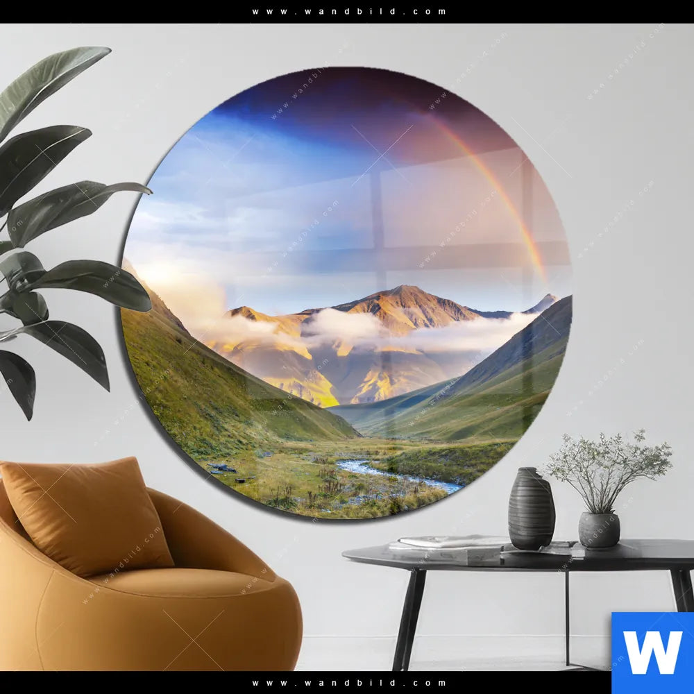 Acrylglasbild | Nebel und Regenbogen zwischen den Bergen | Rund
