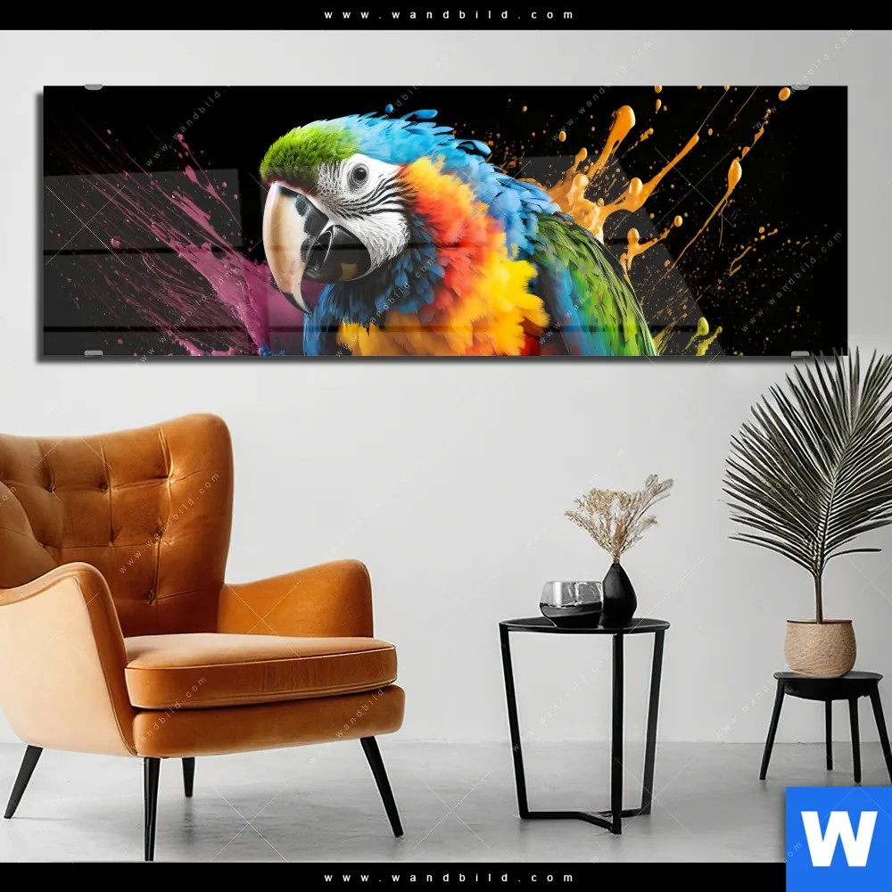 Acrylglasbild | Papagei mit bunten Farbspritzern | Panorama