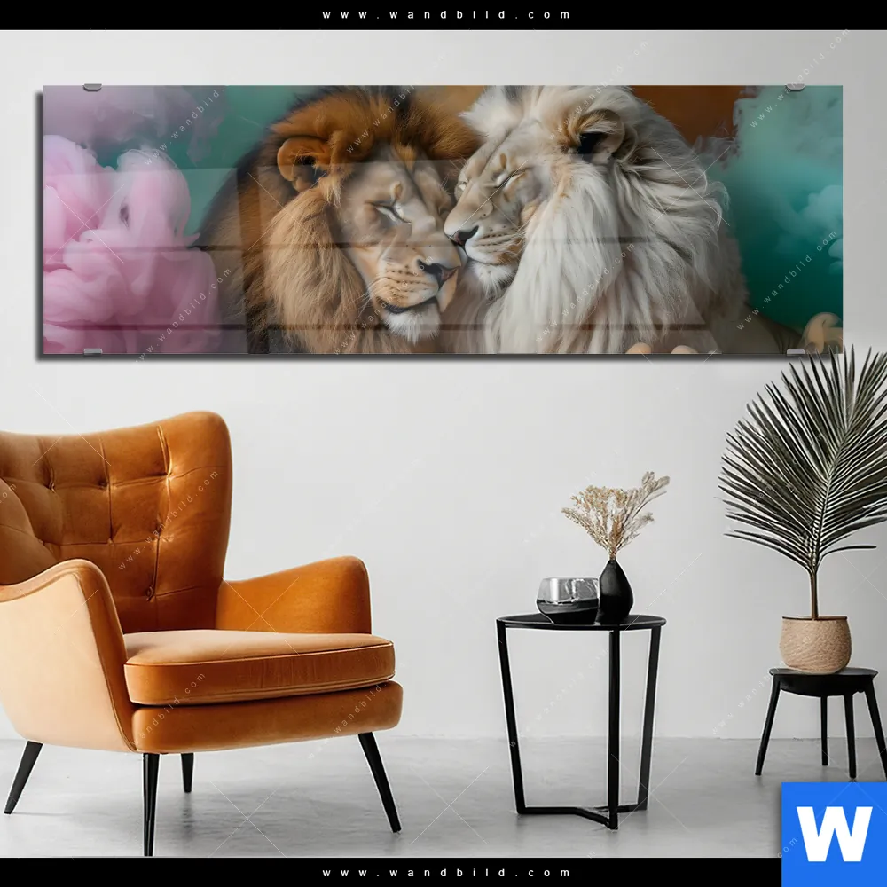 Acrylglasbild | Sanfte Löwenmomente in buntem Nebel | Panorama