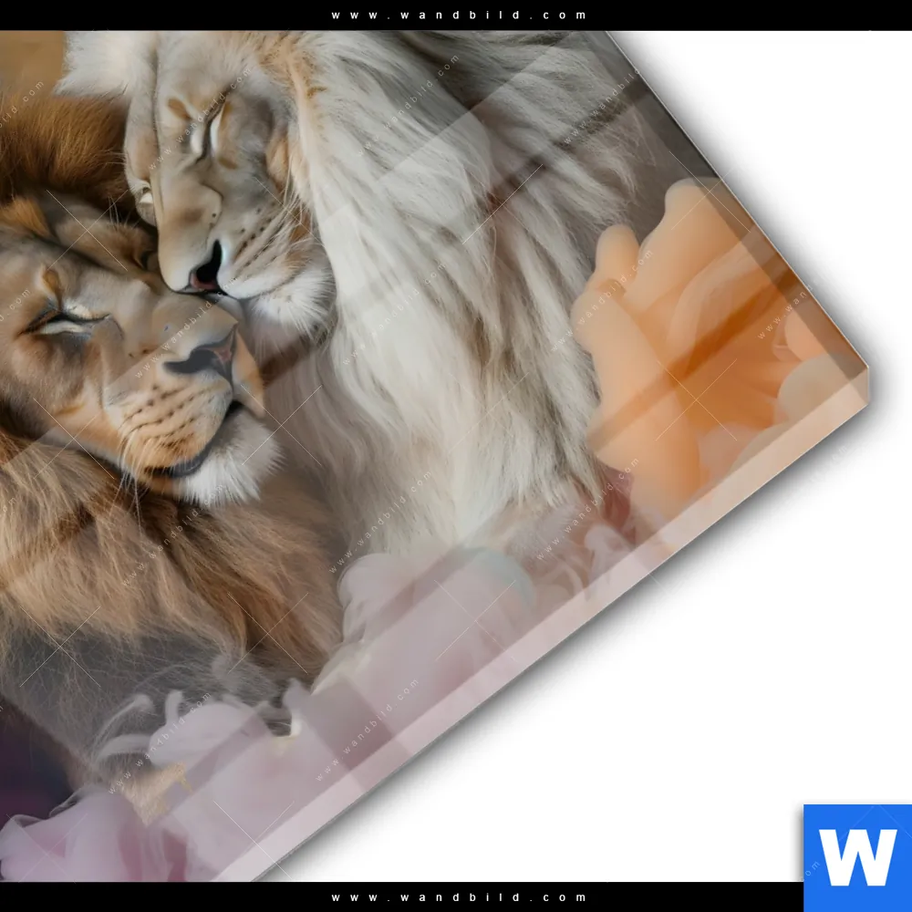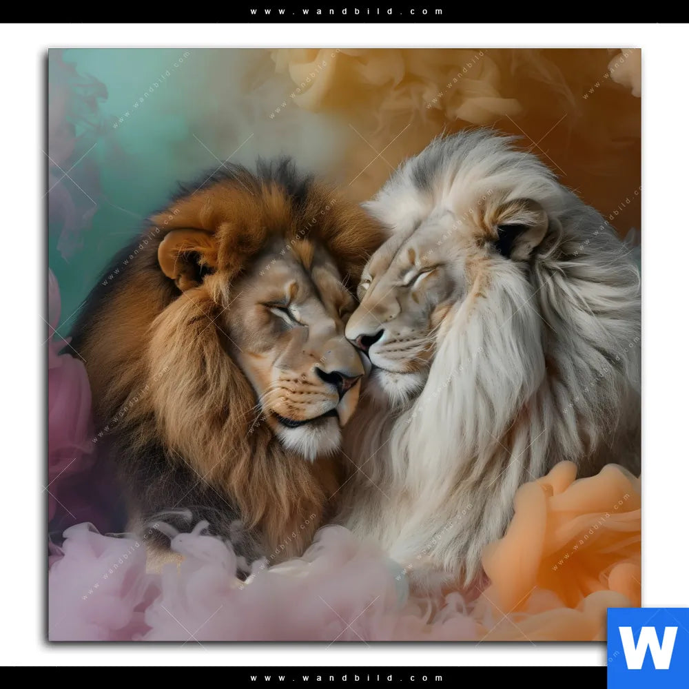 Acrylglasbild | Sanfte Löwenmomente in buntem Nebel | Quadrat
