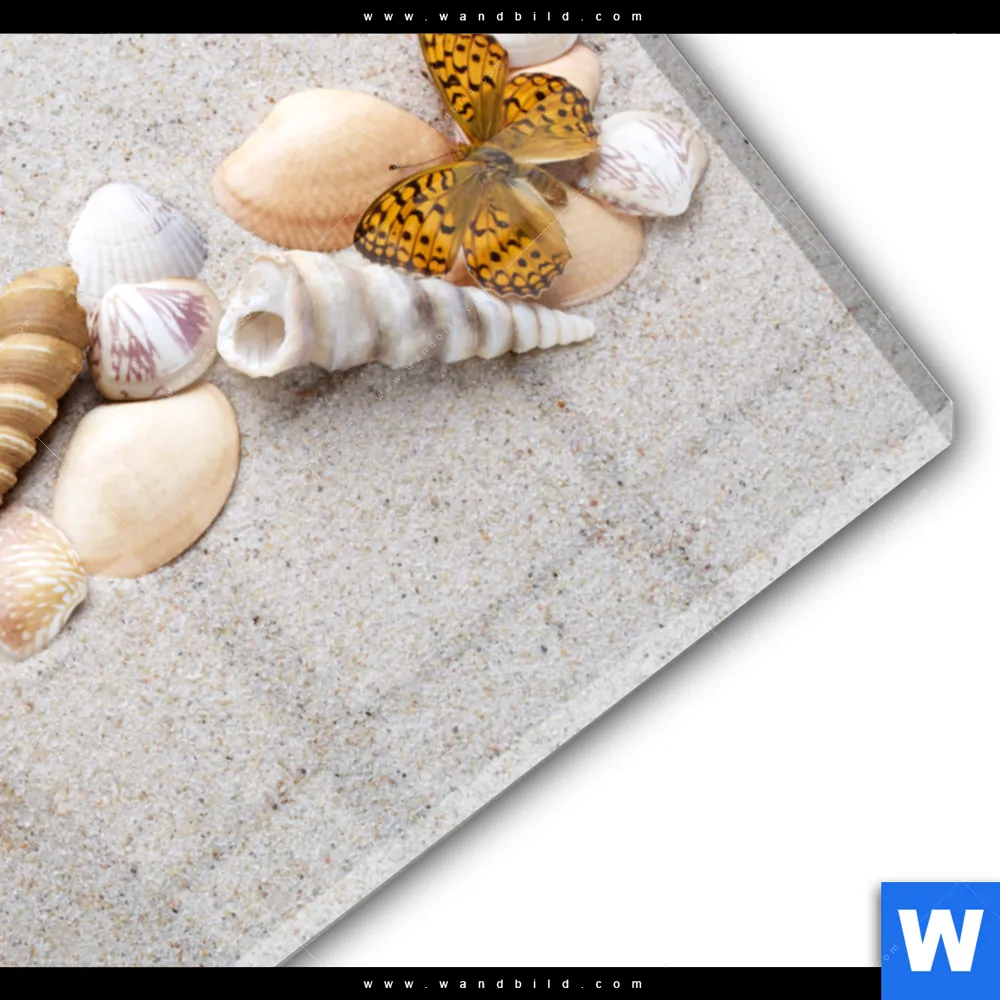 Acrylglasbild | Schmetterlinge & Muscheln im Sand | Querformat