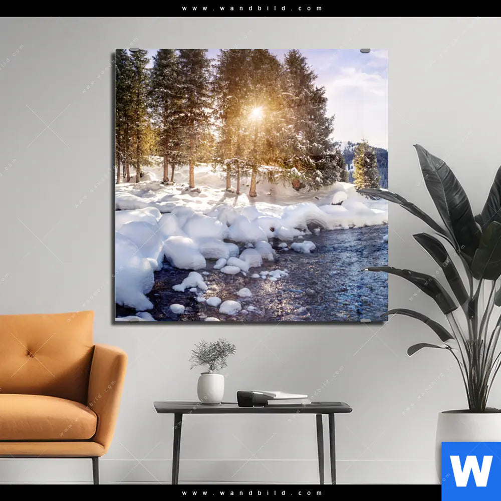 Acrylglasbild | Schneebedeckte Landschaft am Fluss | Quadrat