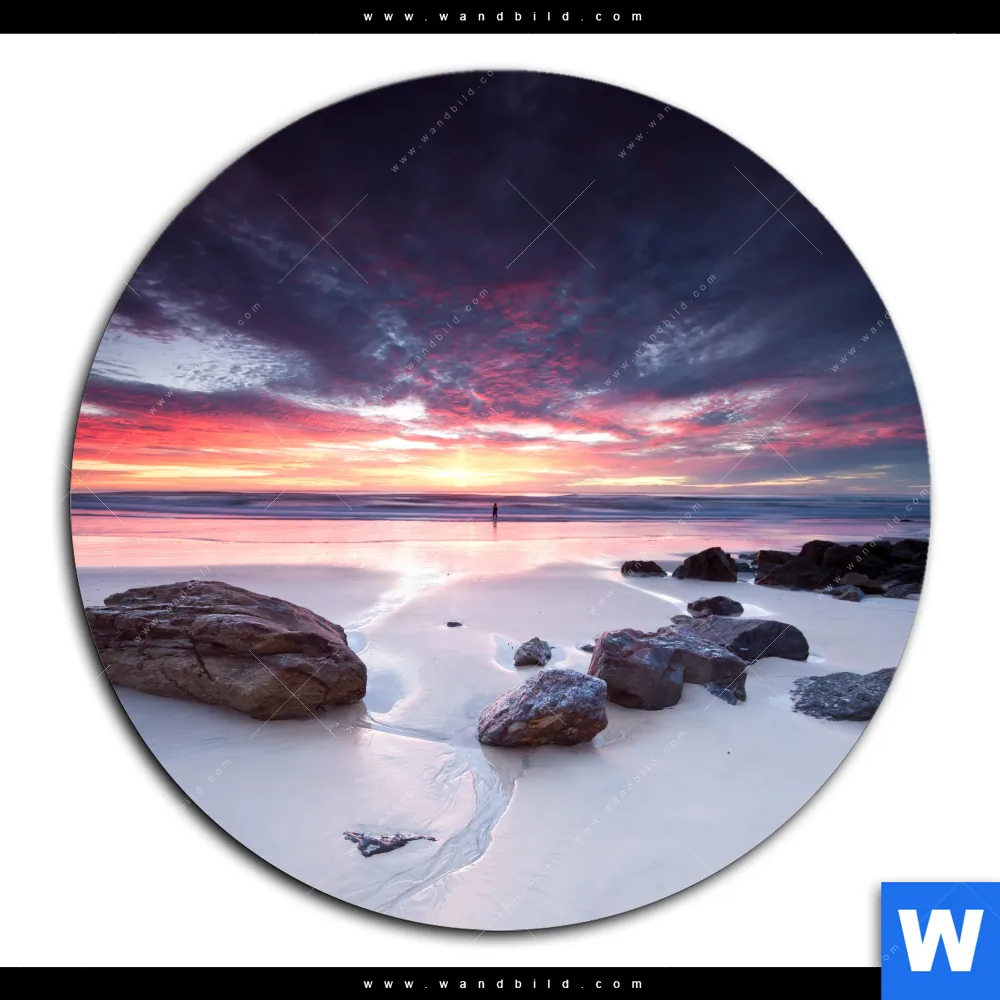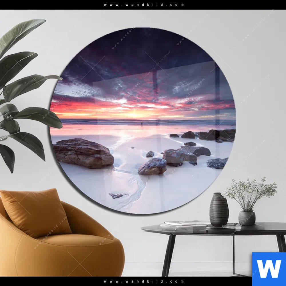 Acrylglasbild | Sonnenaufgang am Strand mit Felsen | Rund