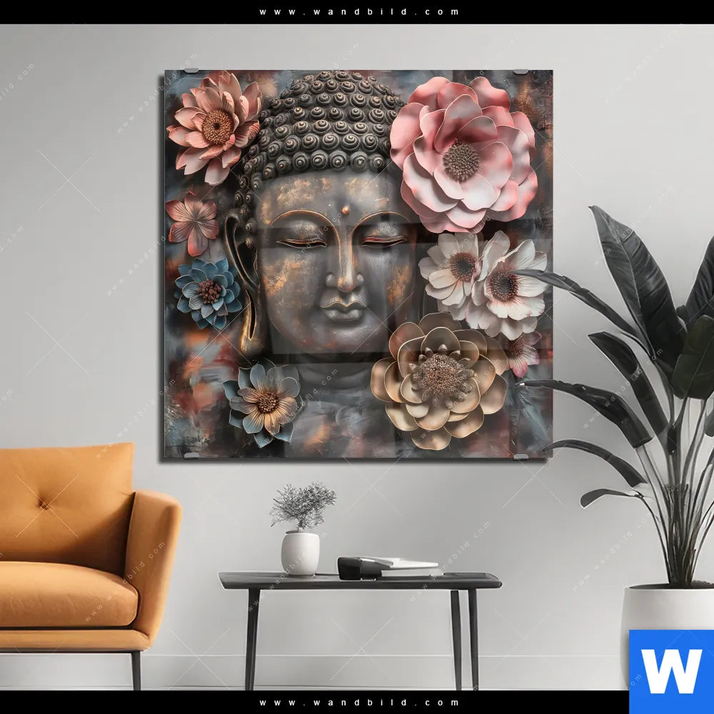 Acrylglasbild | Spiritueller Buddha und Blumen | Quadrat