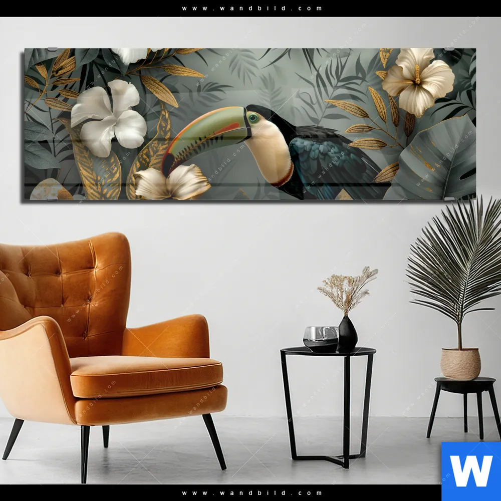 Acrylglasbild | Tukan im goldenen Regenwald | Panorama