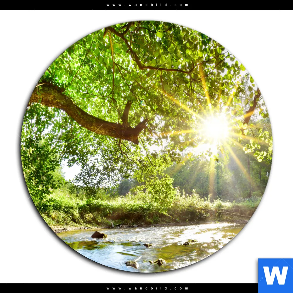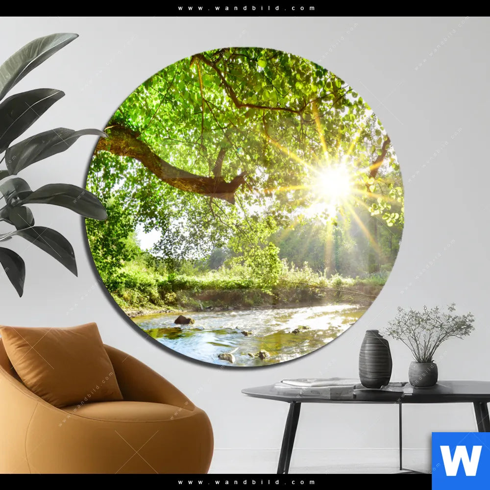 Acrylglasbild | Wald mit Bach bei Sonnenschein | Rund