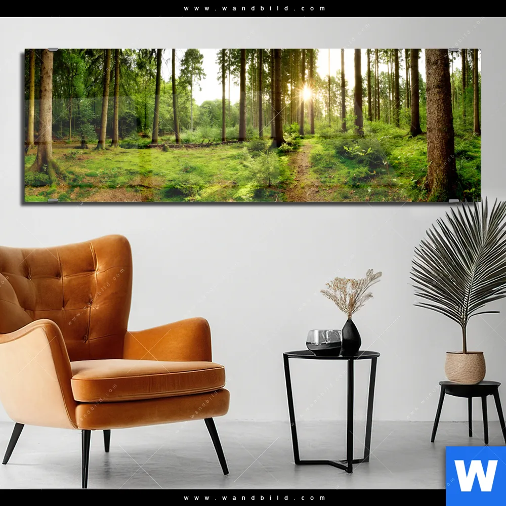 Acrylglasbild | Wald mit Sonnenstrahlen No.2 | Panorama