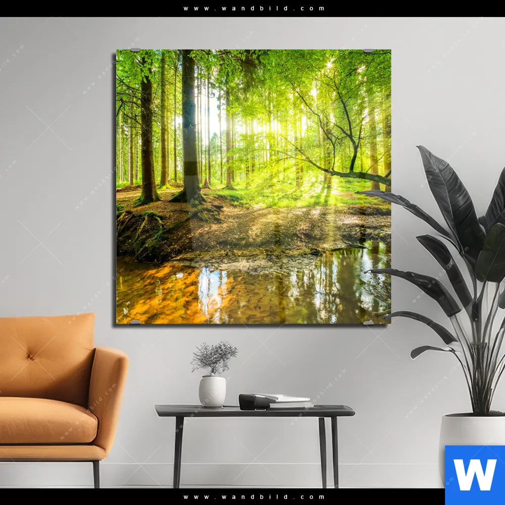 Acrylglasbild | Wald mit Sonnenstrahlen | Quadrat