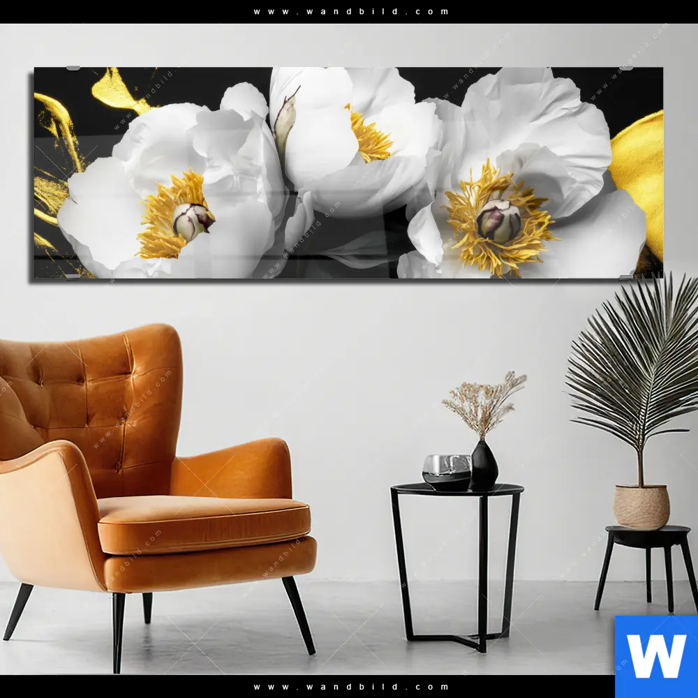 Acrylglasbild | Weiße Blumen mit Gold | Panorama