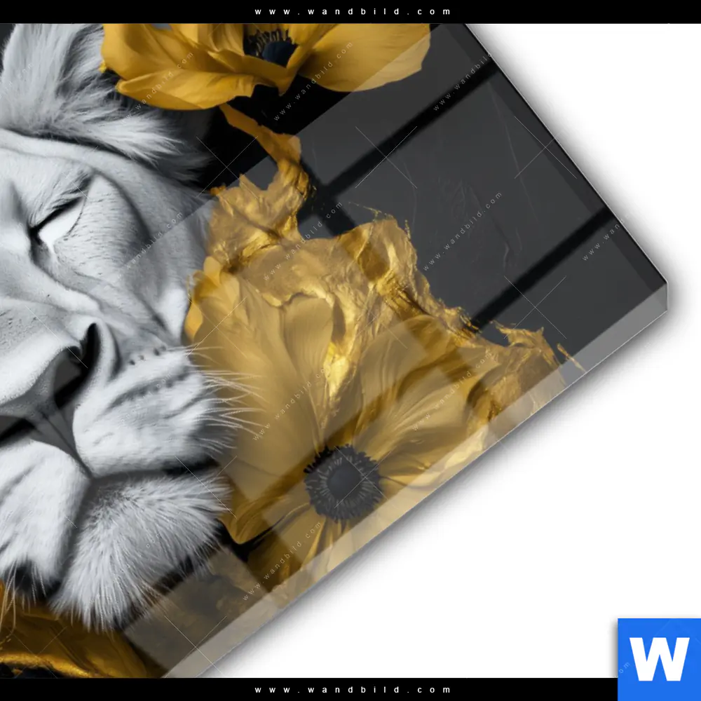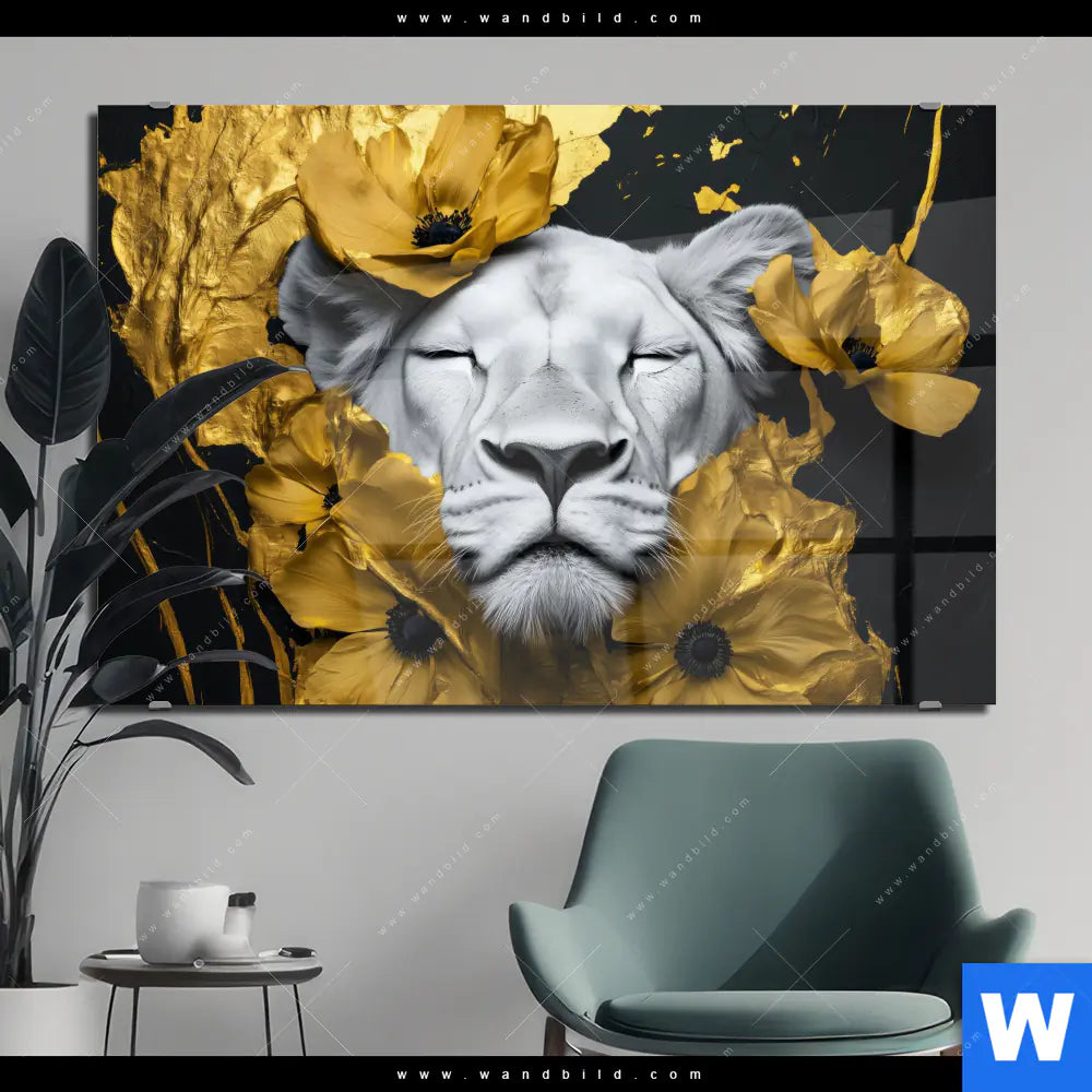 Acrylglasbild | Weiße Löwin mit Goldblüten | Querformat