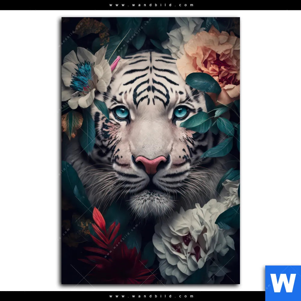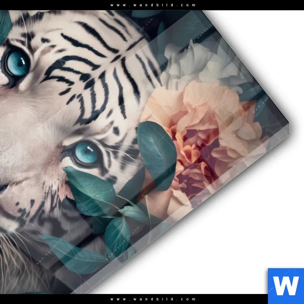 Acrylglasbild | Weißer Tiger mit blauen Augen zwischen Blumen | Hochformat
