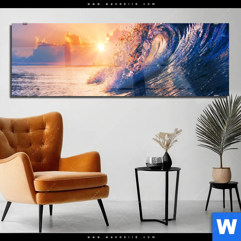 Acrylglasbild | Welle im Sonnenuntergang | Panorama