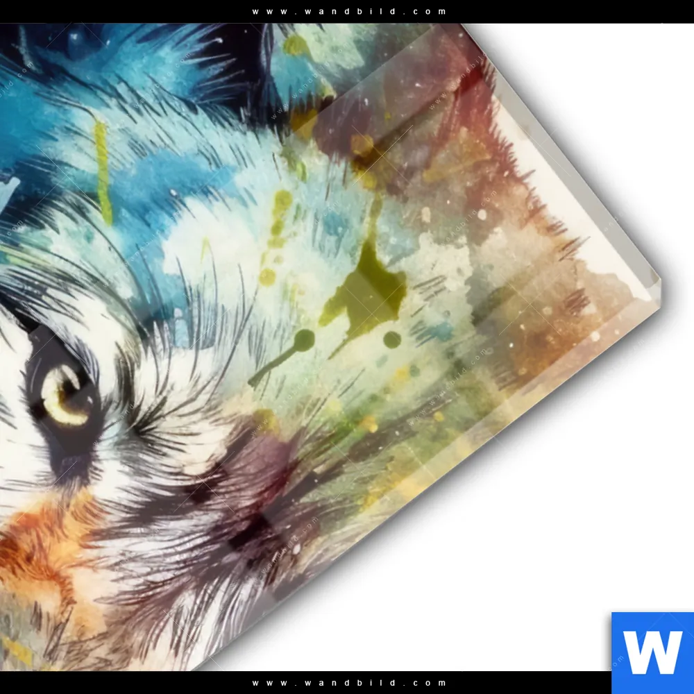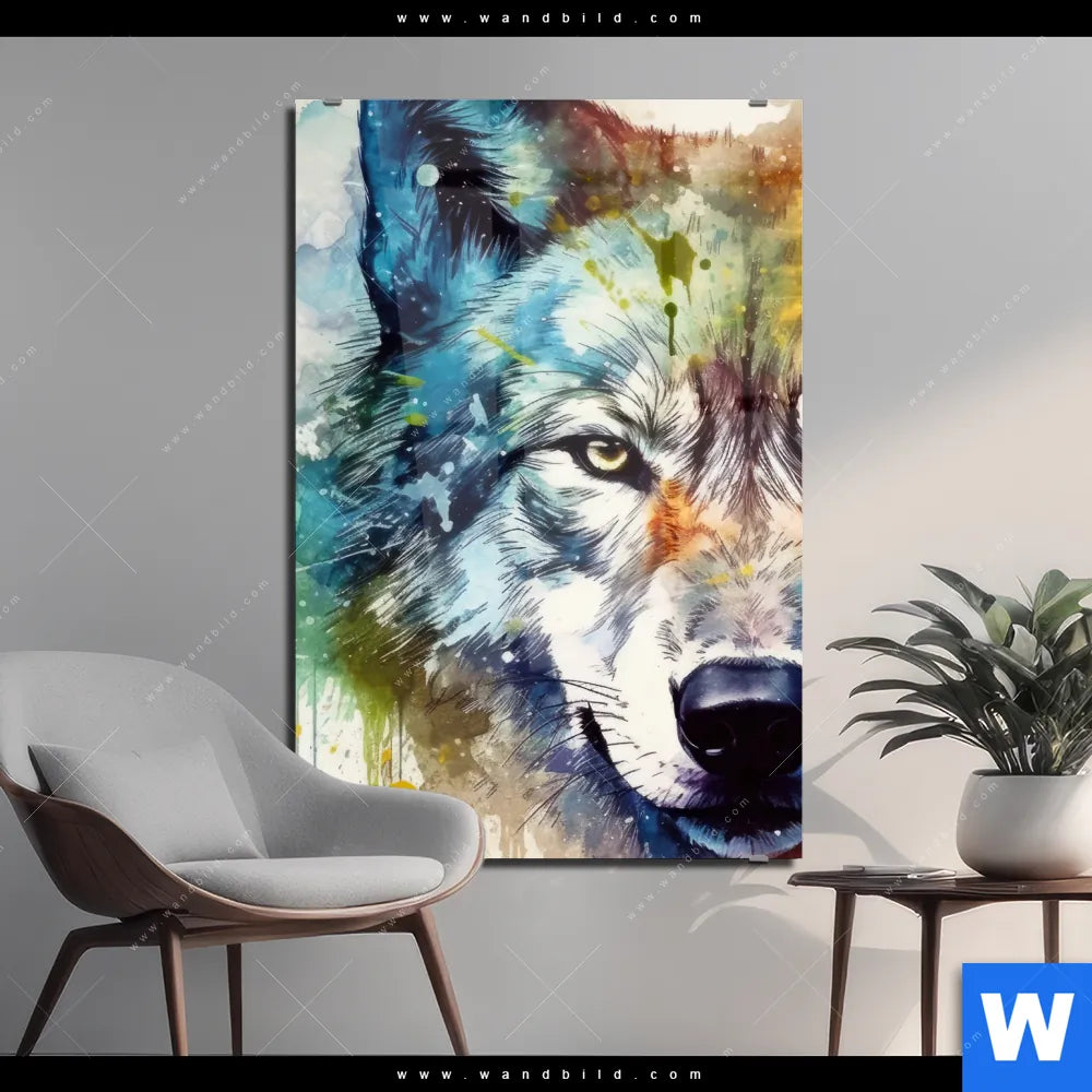 Acrylglasbild | Wolf mit bunten Farbspritzern No. 2 | Hochformat