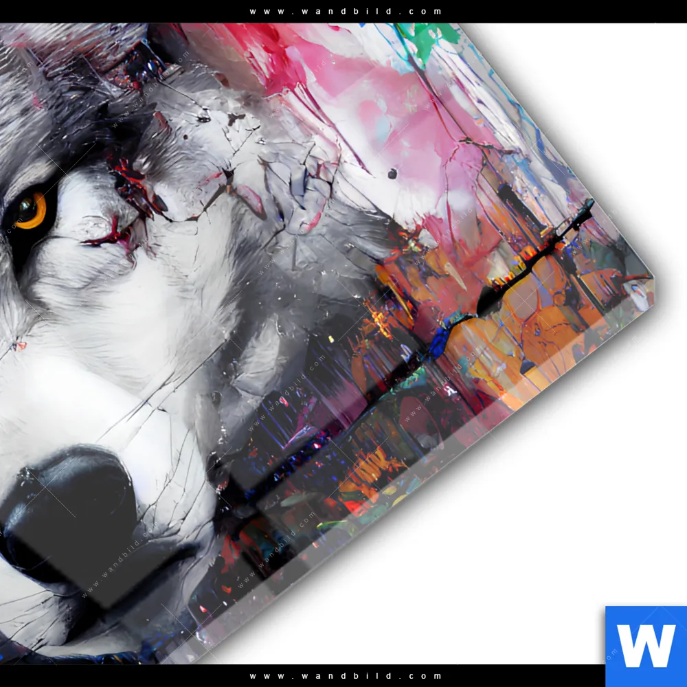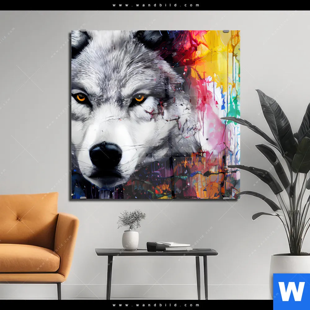 Acrylglasbild | Wolf mit bunten Farbspritzern | Quadrat
