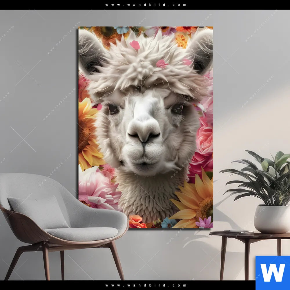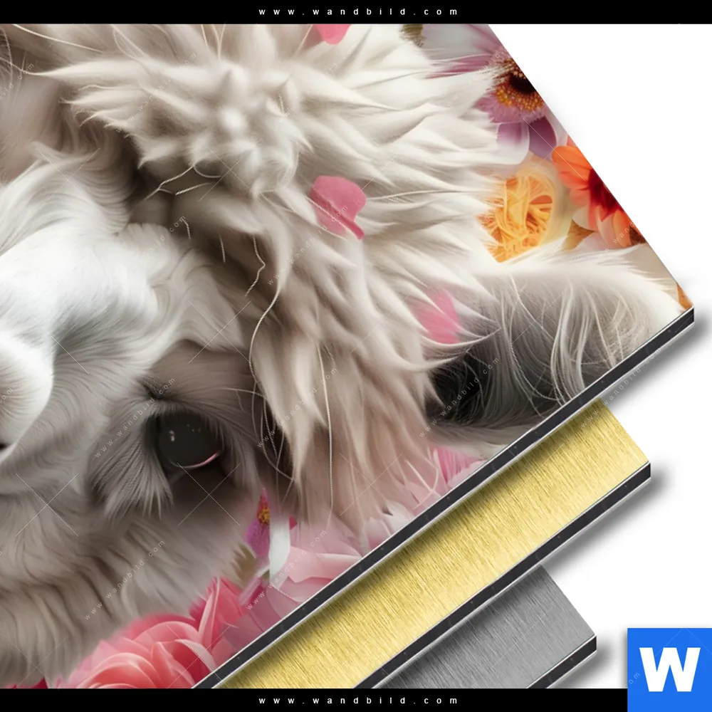 Alu-Dibond Bild | Alpaka mit Blumen | Hochformat