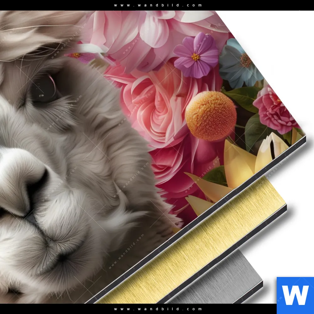 Alu-Dibond Bild | Alpaka mit Blumen | Querformat