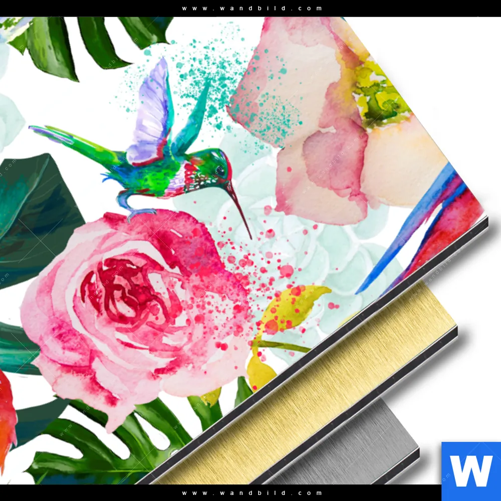 Alu-Dibond Bild | Blumen & Papageien Aquarell | Hochformat