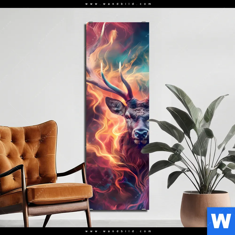 Alu-Dibond Bild | Bunter Hirsch in Flammen | Schmal