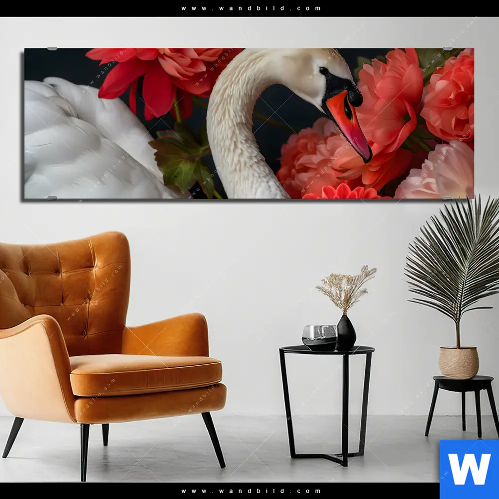 Alu-Dibond Bild | Eleganter Schwan mit Blumen | Panorama