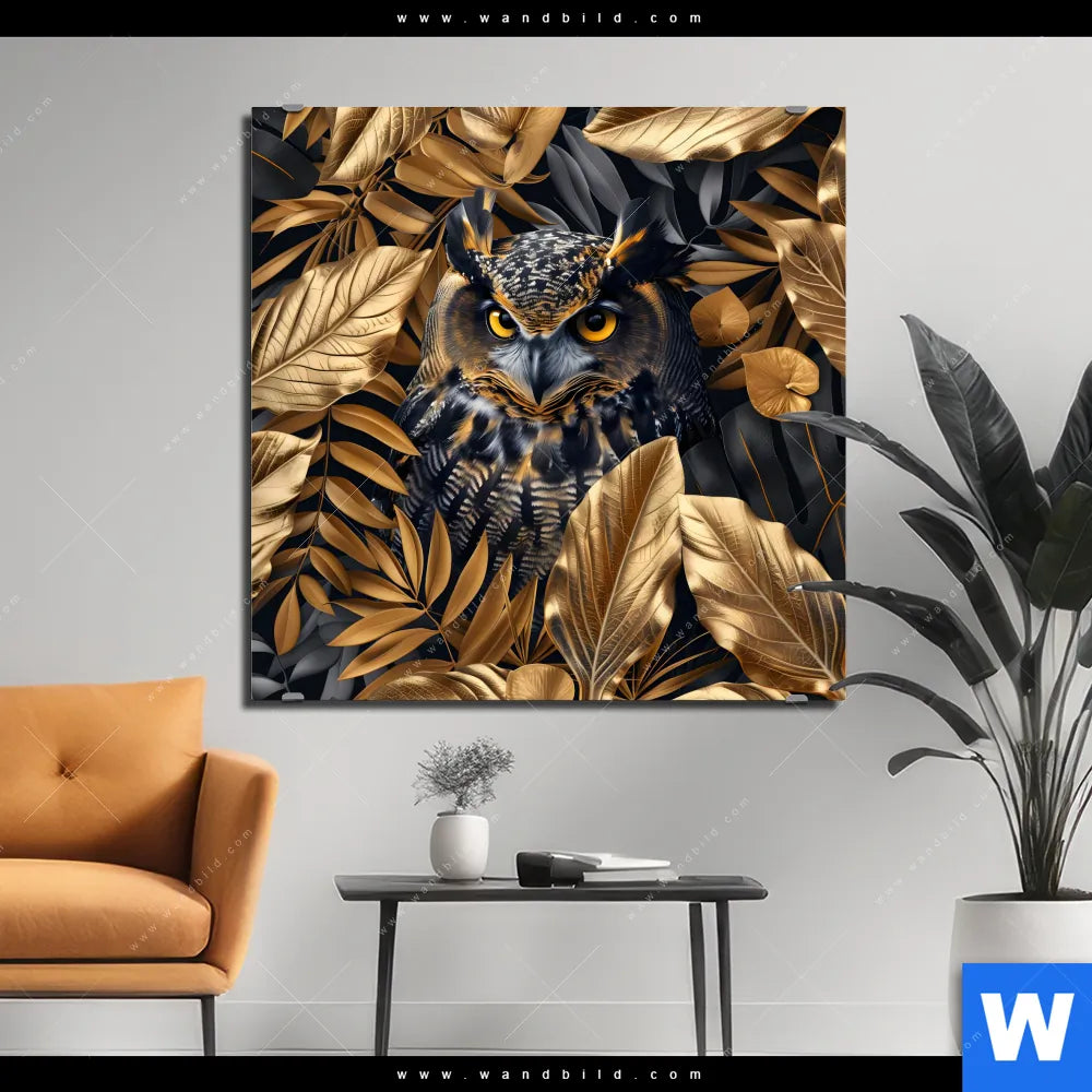 Alu-Dibond Bild | Eule und goldene Blätter | Quadrat
