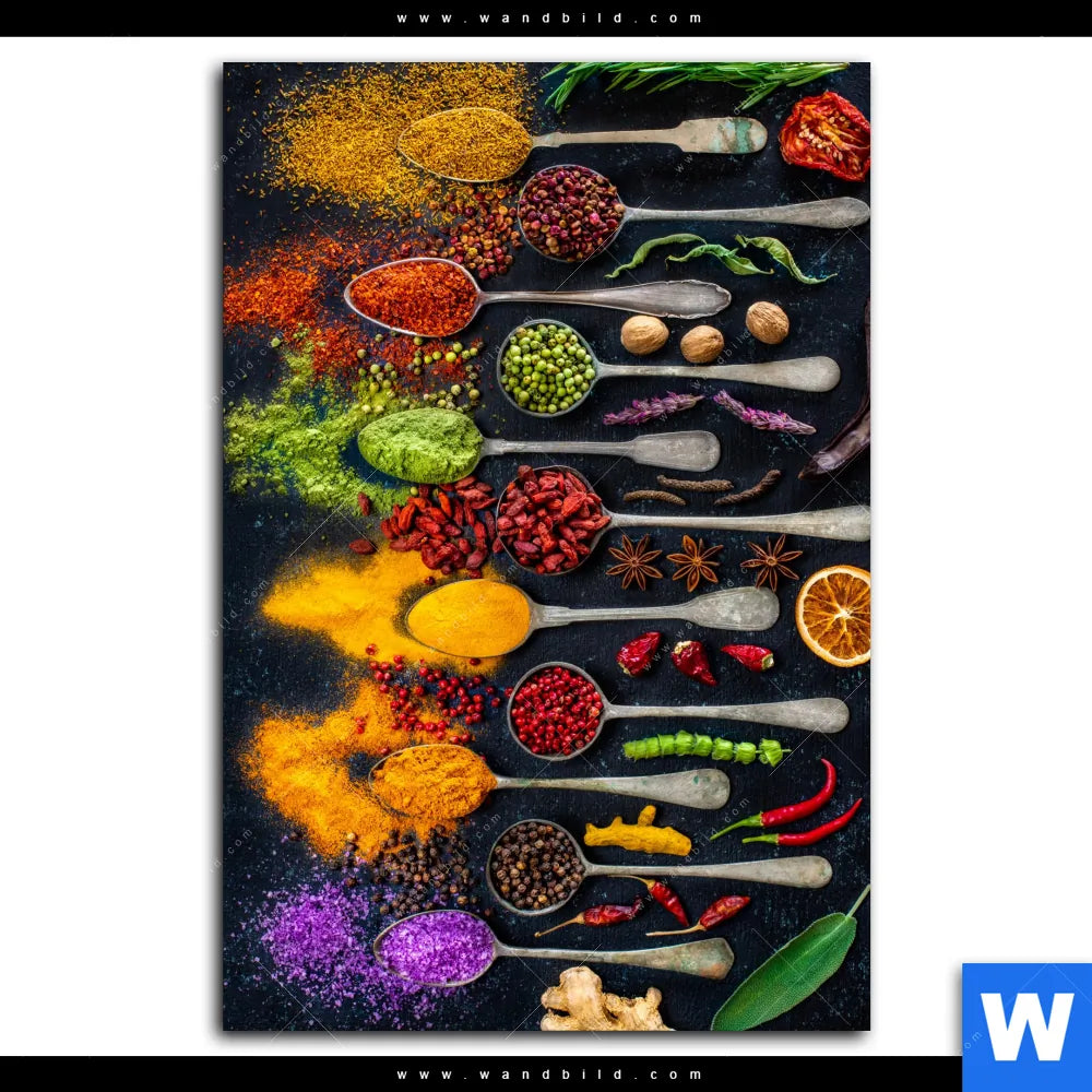Alu-Dibond Bild | Exotische Gewürze auf Löffeln | Hochformat
