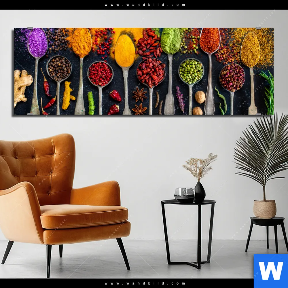 Alu-Dibond Bild | Exotische Gewürze auf Löffeln | Panorama