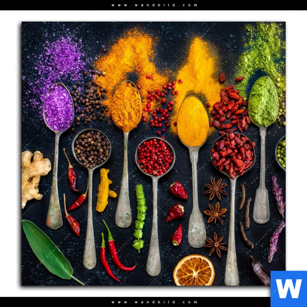 Alu-Dibond Bild | Exotische Gewürze auf Löffeln | Quadrat